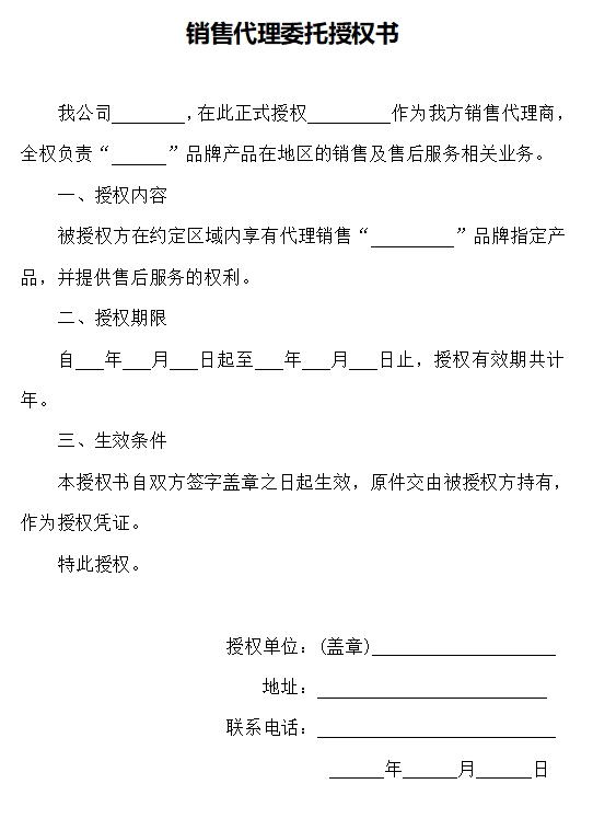销售代理委托授权书