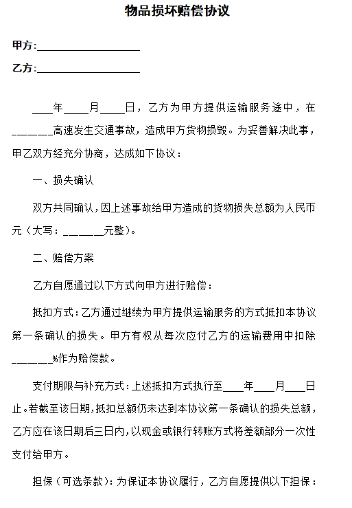 物品损坏赔偿协议