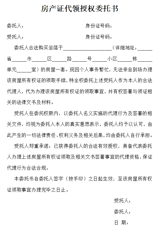 房产证代领授权委托书