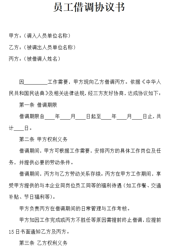 因 工作需要,甲方现向乙方借调丙方。依据《中华人民共和国民法典》及相关法律法规,经三方友好协商,达成协议如下: