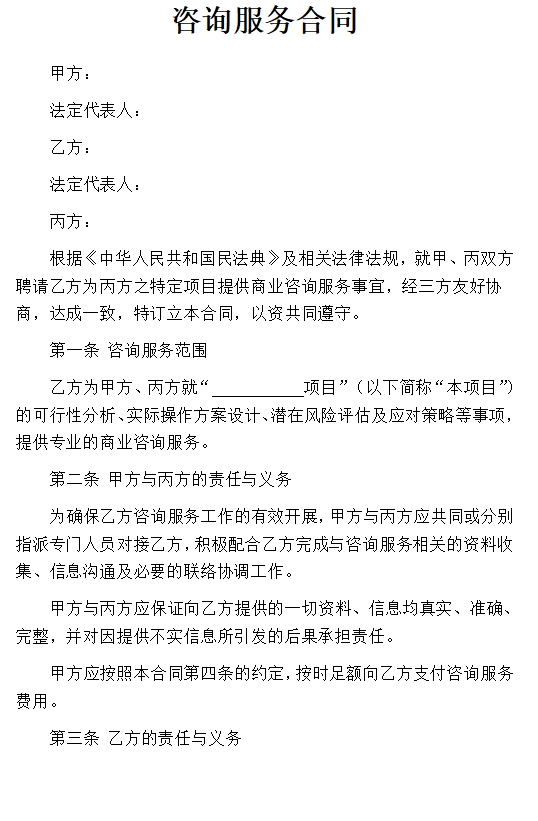 根据《中华人民共和国民法典》及相关法律法规,就甲、丙双方聘请乙方为丙方之特定项目提供商业咨询服务事宜,经三方友好协商,达成一致,特订立本合同,以资共同遵守。