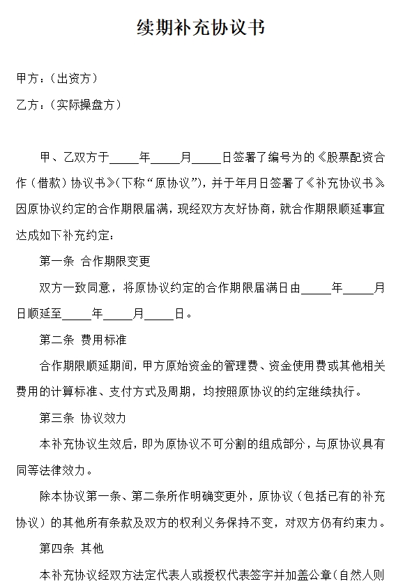 甲、乙双方于 年 月 日签署了编号为的《股票配资合作(借款)协议书》(下称“原协议”),并于年月日签署了《补充协议书》。因原协议约定的合作期限届满,现经双方友好协商,就合作期限顺延事宜达成如下补充约定:
