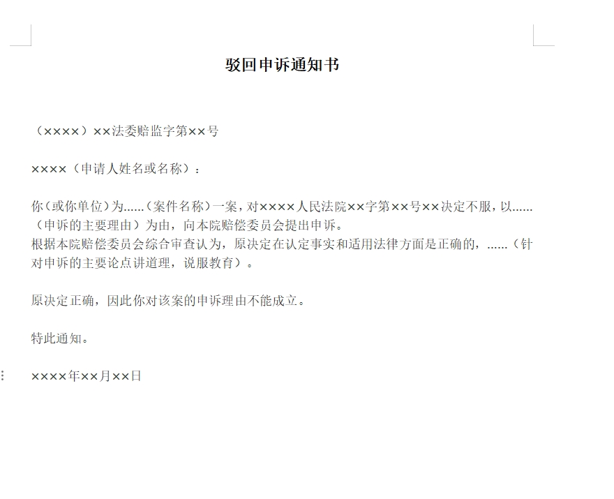 你(或你单位)为……(案件名称)一案,对××××人民法院××字第××号××决定不服,以……(申诉的主要理由)为由,向本院赔偿委员会提出申诉。