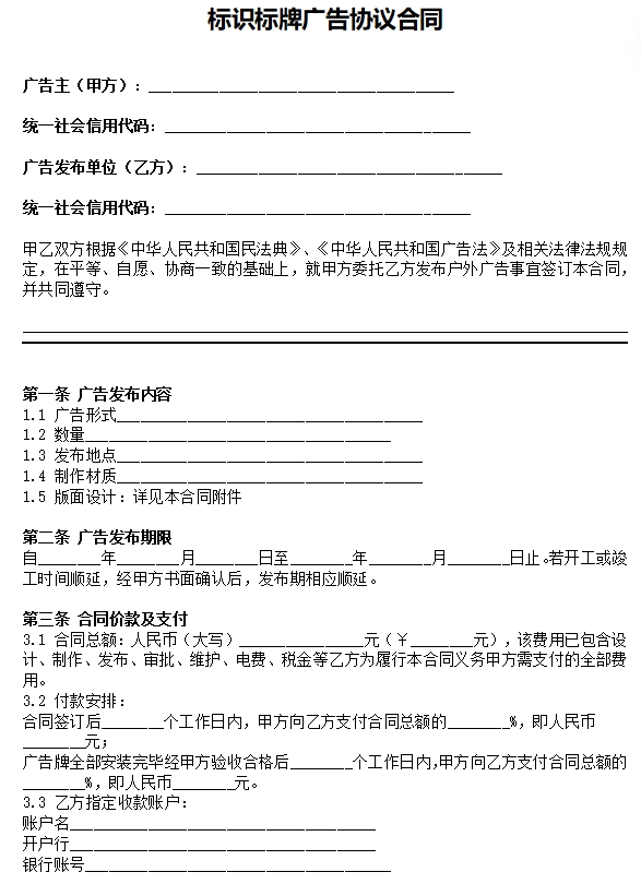 甲乙双方根据《中华人民共和国民法典》、《中华人民共和国广告法》及相关法律法规规定,在平等、自愿、协商一致的基础上,就甲方委托乙方发布户外广告事宜签订本合同,并共同遵守。