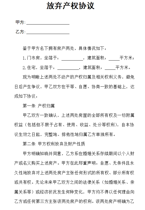 第二条 甲方权利放弃及财产性质