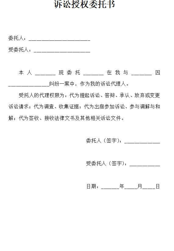 受托人的代理权限为:代为提起诉讼、答辩、承认、放弃或变更诉讼请求;代为调查、收集证据;代为出庭参加诉讼、参与调解与和解;代为签收、接收法律文书及其他相关诉讼文件。