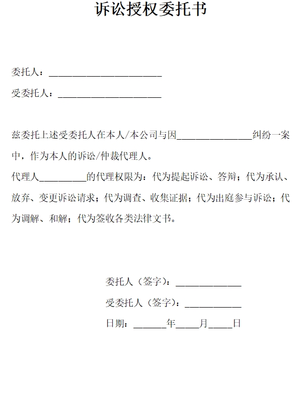 代理人__________的代理权限为:代为提起诉讼、答辩;代为承认、放弃、变更诉讼请求;代为调查、收集证据;代为出庭参与诉讼;代为调解、和解;代为签收各类法律文书。
