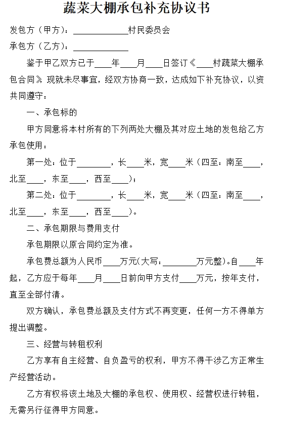 鉴于甲乙双方已于 年 月 日签订《 村蔬菜大棚承包合同》,现就未尽事宜,经双方协商一致,达成如下补充协议,以资共同遵守: