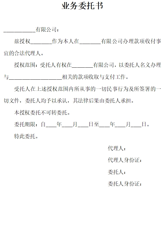 授权范围:受托人有权在________有限公司,以委托人名义办理与____________________相关的款项收取与支付工作。