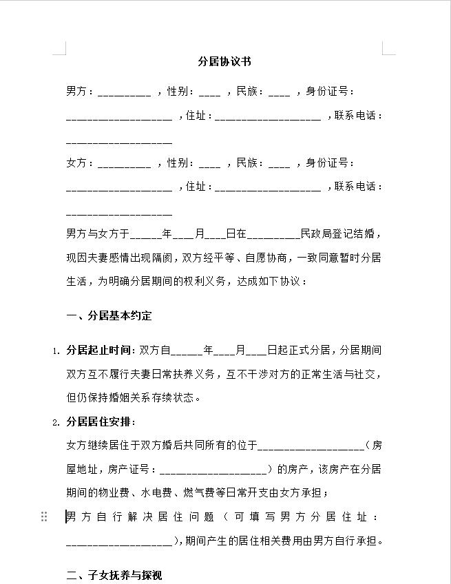 1. 子女日常照料:双方婚生子女__________(性别:____ ,__年____月____日出生,身份证号:________________),在分居期间由女方负责日常抚养、照料(包括饮食、教育、医疗等),女方应保障子女的正常生活与学习。