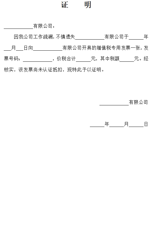 月 日向 有限公司开具的增值税专用发票一张,发票号码: ,价税合计 元,其中税额 元。经核实,该发票尚未认证抵扣,现特此予以证明。