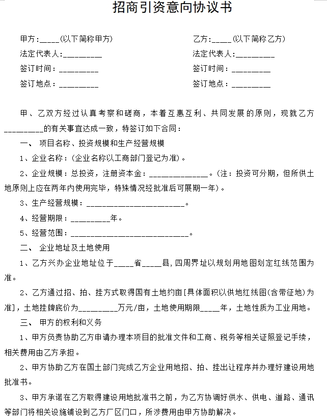 甲、乙双方经过认真考察和磋商,本着互惠互利、共同发展的原则,现就乙方__________的有关事宜达成一致,特签订如下合同: