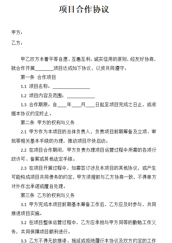 甲乙双方本着平等自愿、互惠互利、诚实信用的原则,经友好协商,就合作开展________项目达成如下协议,以资共同遵守。