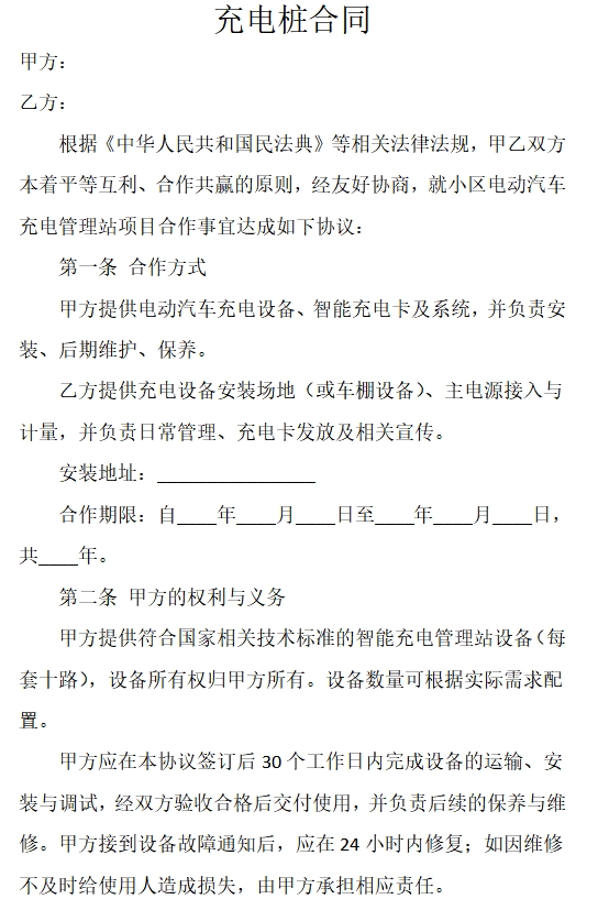 根据《中华人民共和国民法典》等相关法律法规,甲乙双方本着平等互利、合作共赢的原则,经友好协商,就小区电动汽车充电管理站项目合作事宜达成如下协议: