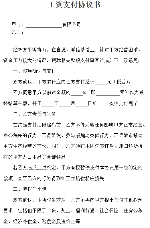 经双方平等协商,在自愿、诚信基础上,针对甲方经营困难、资金压力较大的情况,现就相关款项支付事宜达成如下一致意见: