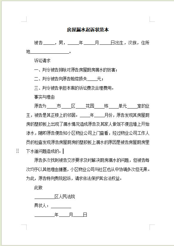 原告多次找到被告交涉要求及时解决厨房漏水的问题,但被告每次均予以其他理由搪塞,小区物业公司与社区也从中协调多次但无果。为此,原告特向贵院起诉,请求依法保护其合法权益。