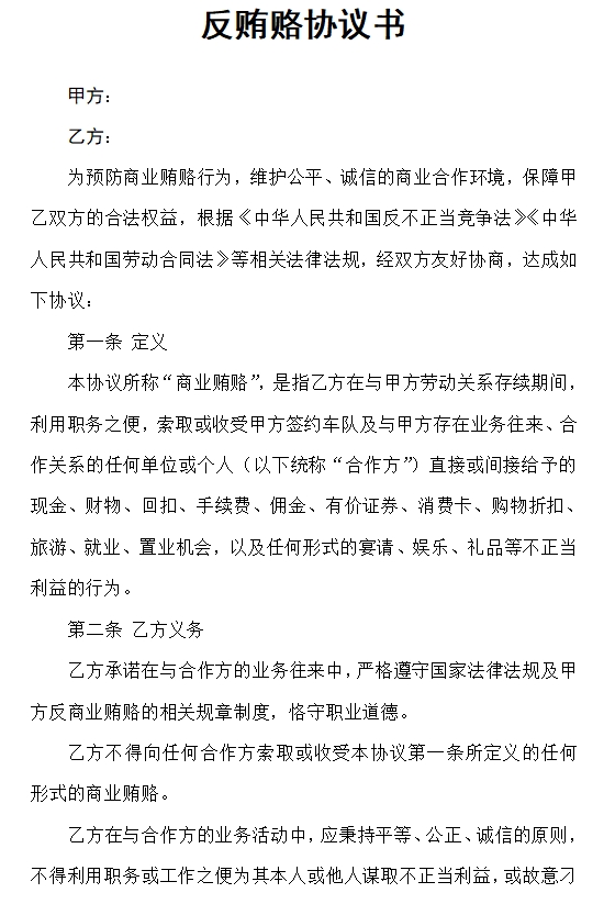为预防商业贿赂行为,维护公平、诚信的商业合作环境,保障甲乙双方的合法权益,根据《中华人民共和国反不正当竞争法》《中华人民共和国劳动合同法》等相关法律法规,经双方友好协商,达成如下协议: