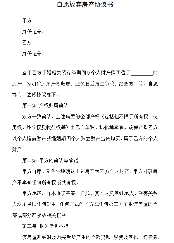 自愿放弃房产协议书