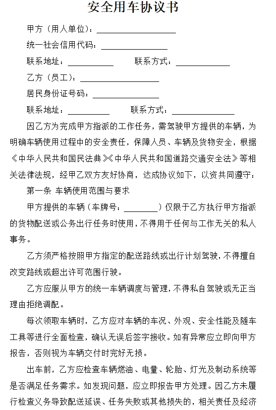 因乙方为完成甲方指派的工作任务,需驾驶甲方提供的车辆,为明确车辆使用过程中的安全责任,保障人员、车辆及货物安全,根据《中华人民共和国民法典》《中华人民共和国道路交通安全法》等相关法律法规,经甲乙双方友好协商,达成协议如下,以资共同遵守: