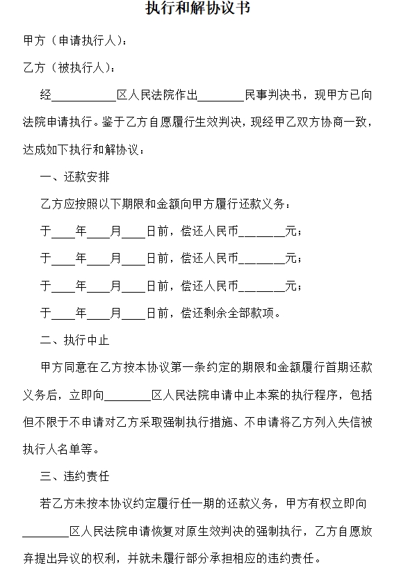 经 区人民法院作出 民事判决书,现甲方已向法院申请执行。鉴于乙方自愿履行生效判决,现经甲乙双方协商一致,达成如下执行和解协议: