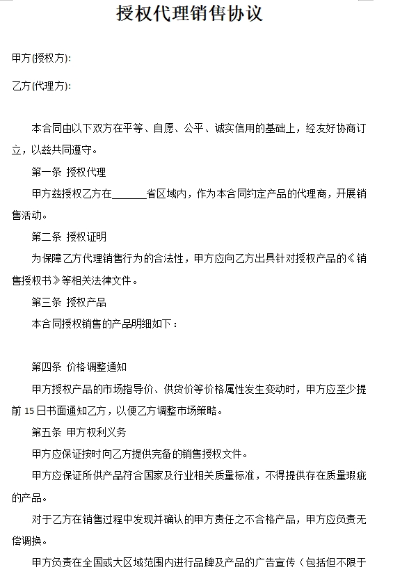 乙方应在获得甲方正式授权后,方可在代理区域内开展销售活动。