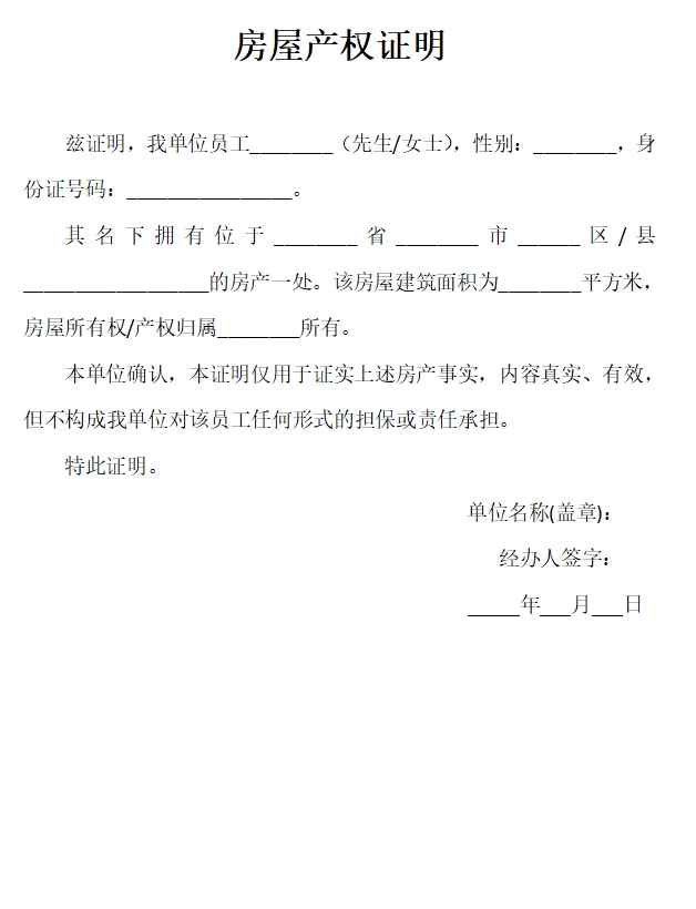 本单位确认,本证明仅用于证实上述房产事实,内容真实、有效,但不构成我单位对该员工任何形式的担保或责任承担。
