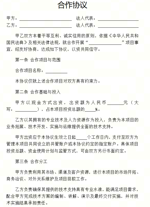 甲乙双方本着平等互利、诚实信用的原则,依据《中华人民共和国民法典》及相关法律法规,就合作开展“ ”项目事宜,经友好协商,达成如下协议,以资共同信守。