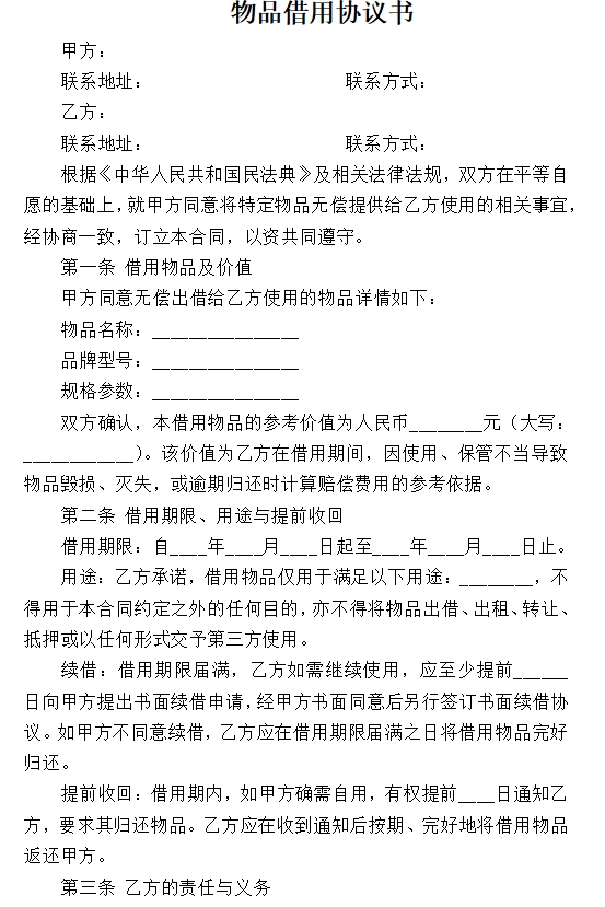 根据《中华人民共和国民法典》及相关法律法规,双方在平等自愿的基础上,就甲方同意将特定物品无偿提供给乙方使用的相关事宜,经协商一致,订立本合同,以资共同遵守。