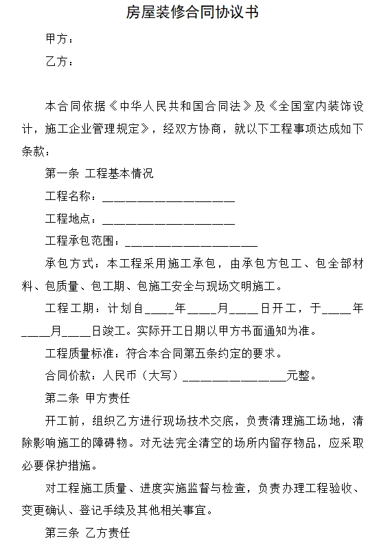 房屋装修合同协议书