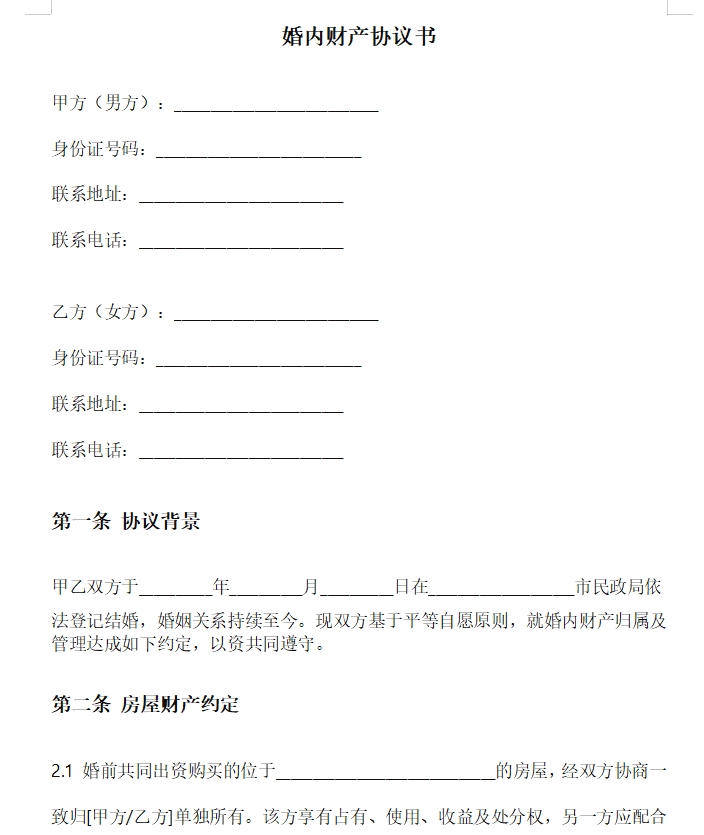 婚内财产协议书