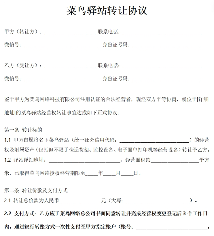 菜鸟驿站转让协议